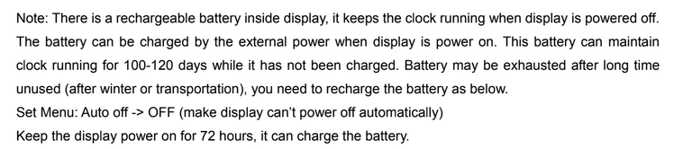The resolution to this is to keep the display powered on for 72 hours, which then allows the battery in the display to charge up from the main battery on the bike. In order to do this, turn off the auto time off function in the display settings so that you can leave the bike sitting in the garage/storage with the display powered on. Make sure the charger is not plugged in otherwise the bike will not power on; the main battery will not deplete over the course of the 72 hours, but its a good idea to periodically check the bike.
